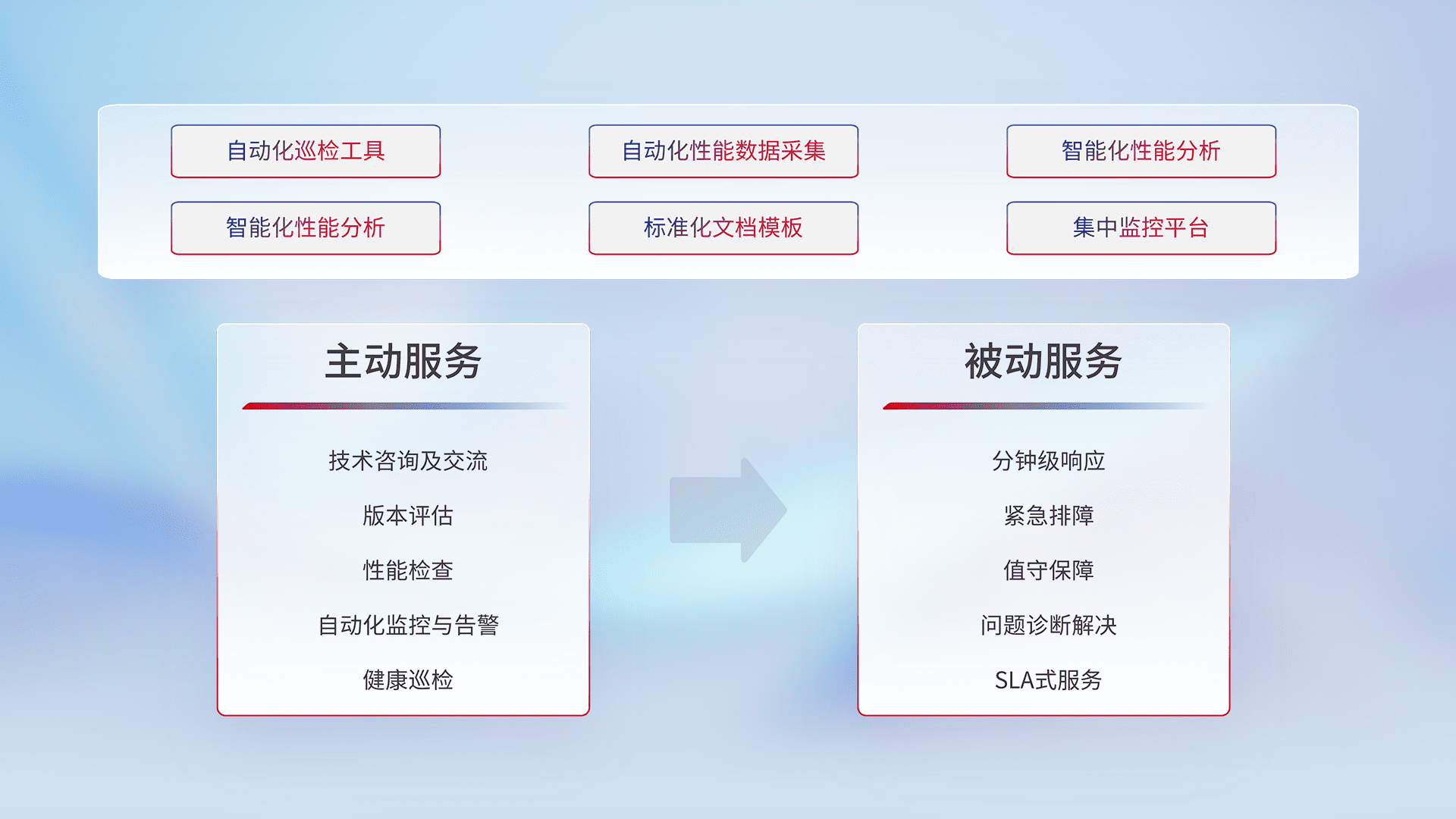 智能化工具和标准化文档,,,,保障服务质量,,,提供主动服务(包含技术咨询、、、、版本评估、、性能检查、、、自动化监控与告警、、健康巡检)和被动服务包含(分钟级响应、、、紧急排障、、、、值守保障、、、问题诊断解决、、SLA服务)。。